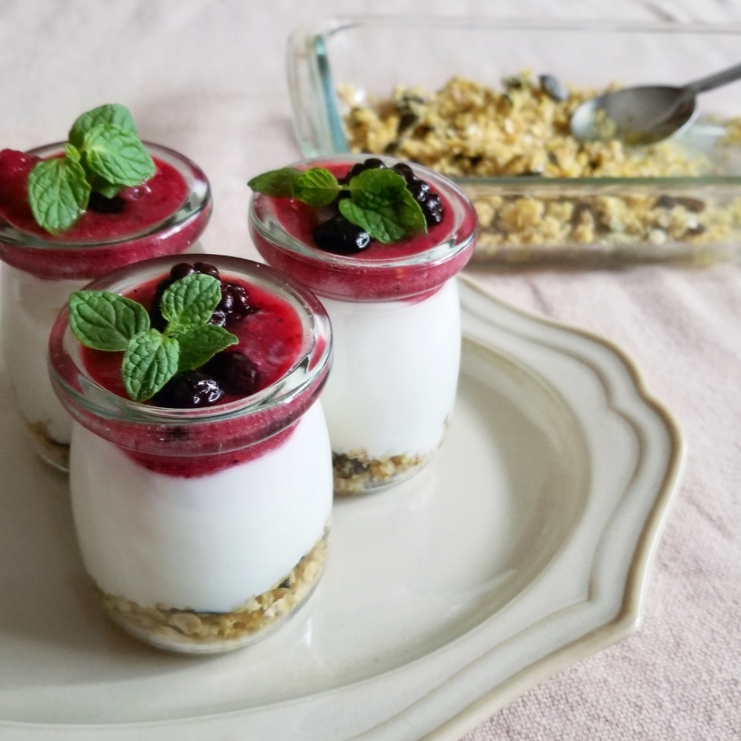 【ターメリックジンジャーグラノーラとヨーグルト(+ベリーソース)】 ヨーグルトにグラノーラをトッピング。グラノーラは甘さ控えめなので、ベリーソースものっけて、おしゃれに仕上げました。 2022.01.28