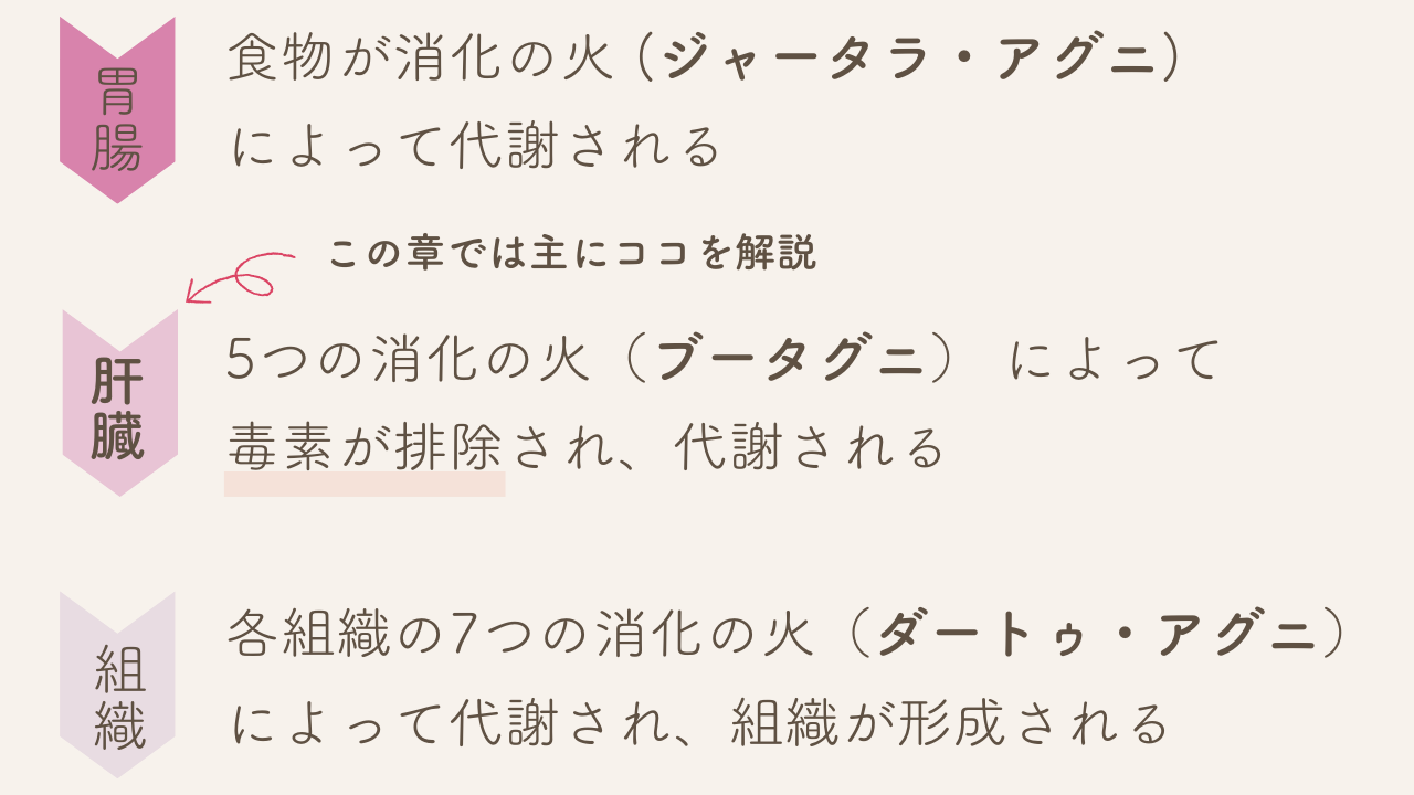 3.肝臓にて5つの消化の火(ブータグニ) によって毒素が排除され代謝される。